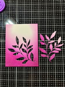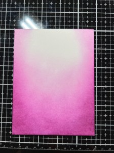 I next, take another 4 1/4″ x 5 1/2″ panel of White Cardstock and begin my ink blending. Using my Blending Brush, I blend Plum Punch Ink onto the lower portion of the panel and up the sides, softening and fading out the ink towards the top. To add some vibrancy to my shading, I blend Dark Orchid Ink to the bottom of the panel and fade the ink out into the previous color, fading as I go up the panel which creates an Ombre affect.