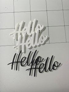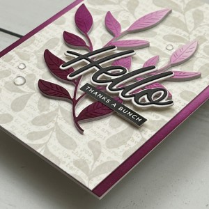 For a greeting, I use the Handwritten Hello Die and take the script piece to cut out of Slate Cardstock two times and the shadow piece to cut out of White Cardstock two times, running them through my P6. I then use Liquid Glue to stack and adhere the pairs together then mount the script piece onto the shadow piece. I add Liquid Glue to the back and mount it over the ink blended branch die to the right of center.