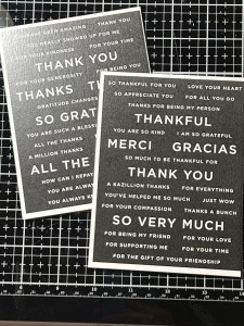 Taking the Sentiment Strips Reverse Gratitude, I choose a sentiment and cut it out using my Guillotine Paper Trimmer. Because a good portion of the sentiment strip will be hanging off of the stacked die cut I glued five pieces of thin cardstock scraps to the back of the strip where it will be hanging off. These stacked scraps will make up the difference and allow the strip to lay flat. I then add Liquid Glue to the back of the strip and stacked scraps then adhere it just under the greeting. Here’s where my dimension changes! After I have my card assembled, I feel like there is more empty space than I wanted with the background… kind of like the branch is just floating. I decided that I wanted the sides to be closer to the die cut piece, so I took my Guillotine Paper Trimmer and cut off the ink blended sides then cut the left side of the panel so it would be a finished 3 3/4″ x 5 1/2″. I then blended the sides of another panel (as nothing else would be showing) and glued my panel onto it then adhered them to a white card base. I felt like this adjustment balanced out the look of my card and it made me feel better, LOL!