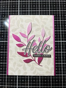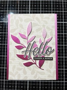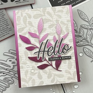 I hope you enjoyed today’s card, I love how it “finally” turned out, LOL! I know the change I made to the card may seem silly to some, but to me when I put so much work into a card I want to love it, not just like it. I know, it would have been fine as is also. 😉 This was a fun card to put together and I really like the fact that it can be used for so many occasions! I find that the “Hello” die is so versatile and the sentiment could be left off and sent as is or it can be chosen later as to fit whichever occasion comes up! Another idea I had was to use some fall colors for the ink blend on the leaves and sides to send out for autumn occasions… the color choices are endless!!