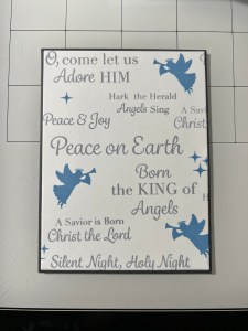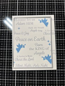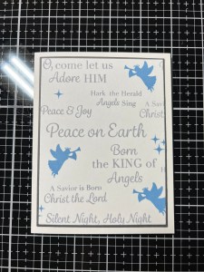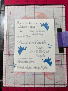 Next, I place two angel and star images from the same Silent Night Stamp Set in between the previously stamped sentiments and stamp them onto the panel using Powder Blue Ink. I then clean off the stamps and arrange them in other areas and stamp them again with the same Powder Blue Ink. *To fill in some of the open areas on the edges of the panel, I stamp more sentiments using the previous Soft Stone Ink.
