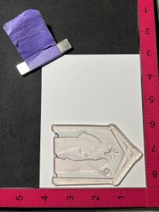 I now want to stamp the star, and I want to emboss it. Leaving the stamp still attached to the door of my MISTI, I flip the cardstock panel around treat the panel with my Anti Static Powder Bag. I mask off everything around the star so that only the star is exposed. I then ink up the star with Versamark Ink, remove the masks then stamp the image onto the cardstock. I add Silver Embossing Powder then heat set it using my Heat Tool then place the panel back into my MISTI. To stamp Mary and Joseph, I take my Slate Ink Cube and ink up those images only and stamp them on to the panel.