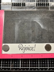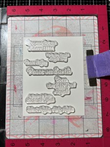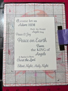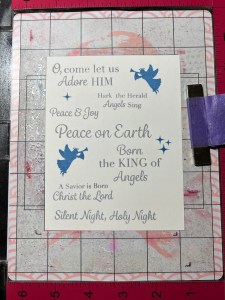 To start, I cut a 4 1/4″ x 5 1/2″ panel out of White Cardstock using my Guillotine Paper Trimmer then place it onto my Sticky Mat in my MISTI Stamp Positioner. I then stagger and place several sentiments from the Silent Night Stamp Set onto the panel and pick them up with the door of my MISTI. I ink up all of the stamps using Soft Stone Ink and stamp them onto my panel.