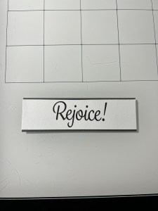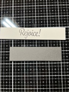For a greeting, I choose the large sentiment from the same Silent Night Stamp Set and stamp it onto a 1″ wide White Cardstock strip using Amalgam Obsidian Black Ink then adhere it onto a 1 1/8″ wide strip of Slate Cardstock using Liquid Glue then trim the ends down to be 3 3/4″ long.