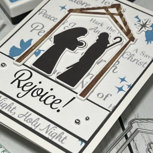 Today, I have a card using the brand new Silent Night stamp set and dies from Gina K. Designs’ September release that is now available!! At 7:00 PM (CST) tonight, Gina will be showcasing all of the new products up close on her Facebook page and YouTube channel, she will wrap up the night making a card with one of the new sets, it’s always a fun time!! The new release can also be found HERE. The set I am using on today’s card is illustrated by Debrah Warner for Gina’s release. This set includes a Nativity scene, angels, stars and many, many sentiments to choose from! Also available for additional purchase are coordinating dies. I chose to use the different sentiments to create a background for my card then mounted the Nativity scene over it. All of the stamps, dies, inks, cardstock and embellishments I use are from Gina K. Designs. Let’s get started!!