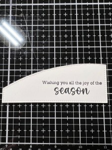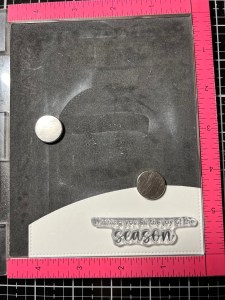 Using the same method, I create a smaller hill that runs the opposite direction then place it into my MISTI Stamp Positioner. I then line up a sentiment from the Penguin Pals Card Kit and stamp it on the hill using Amalgam Obsidian Black Ink. Using Liquid Glue, I adhere the small hill over the lower portion of my panel. *Before adhering to the panel, I added a thin line of glitter to the edge of the hill just as I did with the previous one.