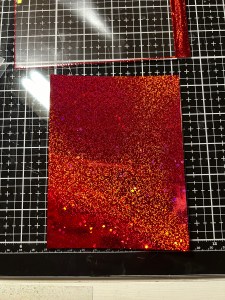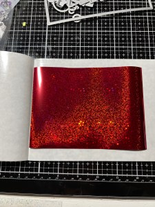 It’s now time to foil! I take one of the card front toner panels (included in the kit) and place it into a Carrier Sheet. I then cut a piece of radiant red foil (also included in the kit) similar in size and place it over the toner panel, pretty side up, close the carrier sheet then run it through my laminator. I then peel away the foil sheet and I am left with a beautiful foiled panel! I repeat this process with the other two colors that are included in the kit, as well as others from my stash. I will use the foiled panels to die cut from. *I will be using the three colors included in the kit, as well as Dazzling Orange, Passionate Pink, Turquoise Sea, Wild Lilac and Sweet Mango foils from my stash.