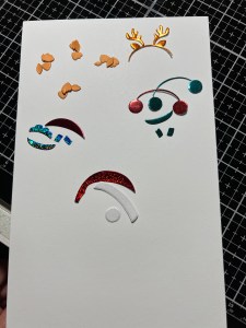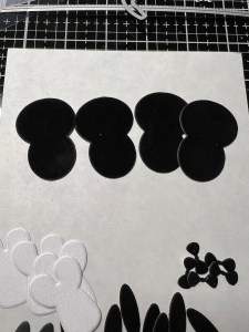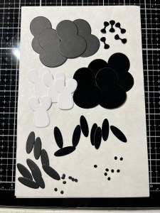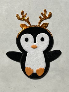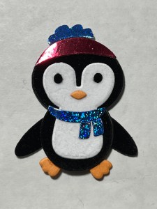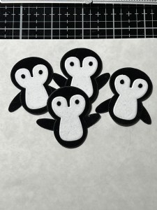 Taking the accessory die pieces from the Penguin Pals Card Kit, I cut out of my foiled panels. I also use the dies that will create the penguin bodies and cut out of plush black paper and white plush paper (included in the kit), running them all through my P6. To make my body pieces sturdier, I also cut them out of Black Cardstock and glue the pieces together. The feet and beaks I cut out of Mango Cardstock.