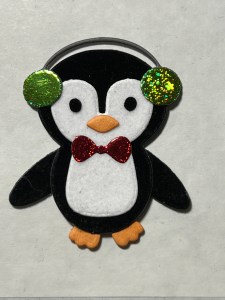 I now assemble all of the pieces and accessorize my penguins using Liquid Glue. For the earmuffs I cut once out of the foil and once out of Slate Cardstock. I then cut the muffs off the foil band then glue them onto the slate cardstock piece. Now that my penguins are finished I adhere them onto the panel using Liquid Glue and Foam Tape.