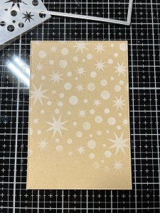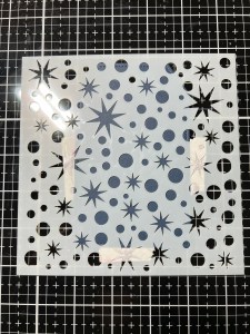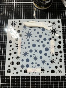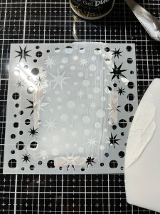 Next, I add some Deco Foil Transfer Gel Duo to the top portion of my stencil and use a Stencil Pal to evenly drag the gel down the stencil, covering all of the openings. I then carefully remove the stencil and set the piece aside to dry for a few hours. You will know the gel has dried when it turns clear. *After removing the stencil, I immediately wash off my stencil and tools using warm water.
