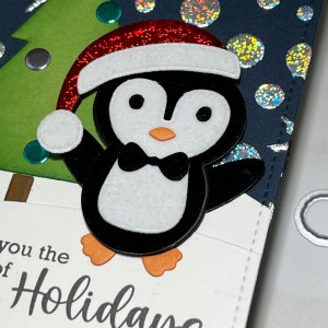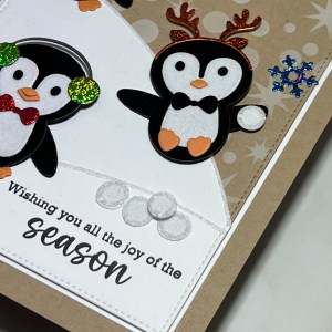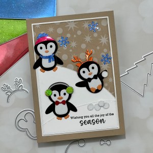 I thought it would be fun to add some snowballs to the mix! I took a couple of the circular dies from the kit and cut out of white flock (included in the kit), running them through my P6 then added some Liquid Glue around the edges then sprinkled with glitter and adhered them to the panel and placed one in the hand of the penguin sliding down the hill. I also added some die cut brilliant blue (included in the kit) foiled snowflakes to the snow blended background. Finally, I mounted the panel onto a 5″ x 7″ Kraft card base (7″ x 10″ piece of cardstock, scored at 5″) using Liquid Glue and this completes my card.