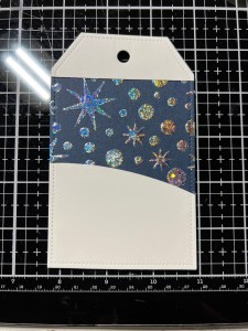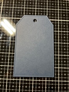 For my tag, I take the largest die from the Tag Trio Die Set and cut out of In The Navy Cardstock, running them through my P6. I then take the stencil from the Penguin Pals Card Kit and adhere it over my die cut piece using Pixie Tape.
