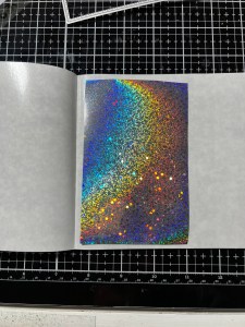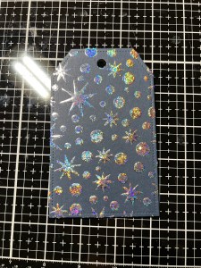 Now that my piece has completely dried and is clear, I cut a piece of Sparkling Silver Foil from my stash and placed it over the tag, pretty side up then into a Carrier Sheet and run them through my laminator. I then peel the foil sheet away from my tag and I now have a beautiful silver foiled background on my tag.