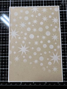 To start, I take the large stitched rectangle die from the Master Layouts 8 Die Set and cut out of Kraft Cardstock, running them through my Platinum 6 Die Cut Machine. Next, I take my stencil from the Penguin Pals Card Kit and adhere it down over my panel using Pixie Tape. I then take my Blending Brush and blend White Pigment Ink over the stencil, covering the openings. *I designate one of my brushes to use with only white pigment ink.