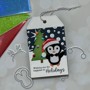 I cut a snowy hill in the same way as I did for my card, and I die cut a topper by using the same tag die and adhered them to the tag using Liquid Glue. I then stamped a sentiment from the kit on the smaller hill using Amalgam Obsidian Black Ink and adhered it to the bottom of the tag. Using the tree die from the kit, I cut out of Grass Green Cardstock then blended Grass Green Ink around the edges of the die. I also used the small circle die from the kit to cut some ornaments from my foil pieces and glued them to the tree. Finally, I mounted the penguin and tree die cuts to the tag using Liquid Glue and Foam Tape, added twine to the top and this completes my tag.