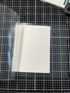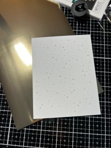 To start my card, I take a Flurries Poly Glaze panel along with a piece of Champagne Deco Foil and run them through my Fuse Laminator on the number 3 setting. To do this, I position my Poly Glaze panel up against the fold of the laminating folder that comes with the machine. I then trim a piece of Champagne Deco Foil and place it pretty side up, over my panel. I then close the laminating folder and run it through my Fuse Laminator, with the folded side going into the machine first. **I did notice some wrinkling of the foiled piece after running it through the laminator, however, it didn’t seem to affect the finished result. Afterwards, I tested trimming the foil into a smaller piece so it would only lay over the design and not the edges of the panel. That seemed to work much better and had a lot less wrinkling. Something to try if you experience wrinkling.