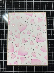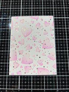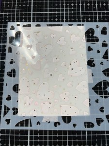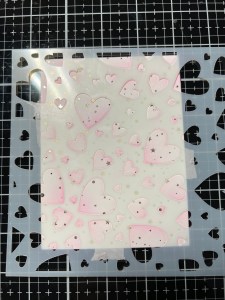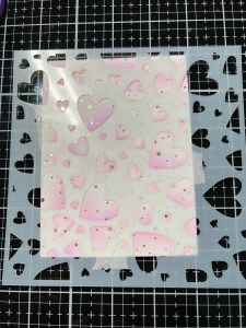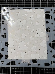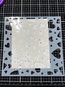 Next, I place my Tumbling Hearts Stencil over the panel and secure it in place using Pixie Tape then run them through my P6. **Check the owners manual for your machine on how to dry emboss. For my P6, I use the Platform Base A, Platform Top B, Rubber Mat E, my cardstock, stencil, Adaptor Plate D and the Shim F, in that order.
