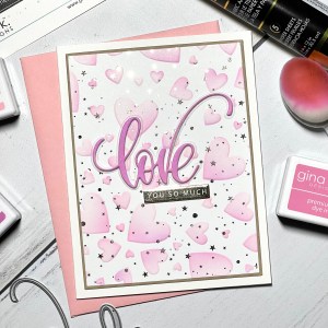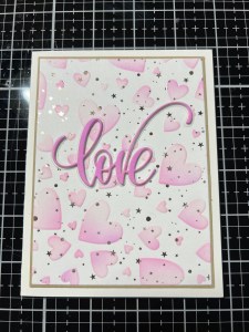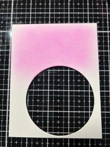 Leaving the stencil still attached to my panel, I begin my ink blending. I want to give the hearts a soft, faded look. I start by taking Light Carnation Ink and blending it lightly over the entire panel, using my Blending Brush. I then take Light Orchid Ink and blend it over different portions of the hearts, being careful not to completely cover up the previous color. To finish, I take my Mini Blending Brush and blend Bubble Gum Pink Ink over the very edges of the ink blend to add some depth and color variation.