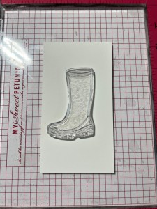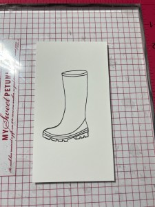 To start, I place a piece of White Cardstock onto my Grip Mat in my MISTI Stamp Positioner and stamp the outline boot image from the Wishing You Well Stamp Set onto the cardstock, using Amalgam Obsidian Black Ink. ***I replaced the mouse pad (black foam insert) in my MISTI with a grip mat which has been a game changer in holding cardstock in place while stamping without the need for magnets or tape. This grip mat is also great to use with ink blending or stenciling. Because it is made out of the same high quality photopolymer, it can be cleaned the same way you clean your stamps or with mild soap and water, I cannot recommend this grip mat enough!!