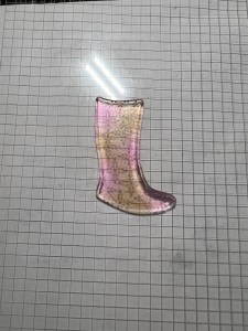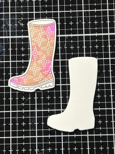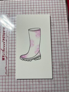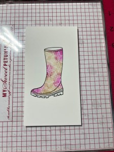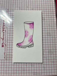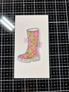 To create the inked design, I take the solid boot image from the same Wishing You Well Stamp Set and center it over my outline image. I then pick up the stamp with the door of my MISTI and ink random areas using my Mini Blending Brush to apply Medium Orchid Ink onto the stamp and stamp it onto my cardstock. I continue applying ink in the same way and stamp it until I have the vibrancy I’m looking for.