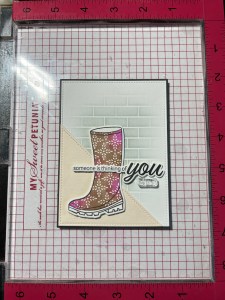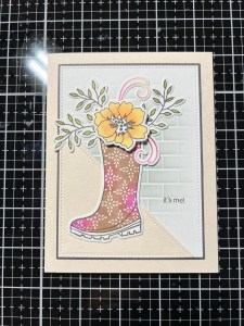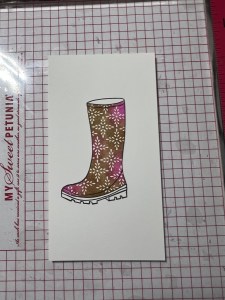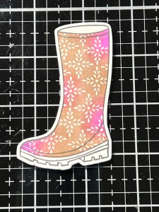To pop the flower up a bit, I add a Foam Square to the back and mounted it over the top of the boot. Using Liquid Glue I mount my sentiment die cut piece over the boot, just above the sub sentiment.