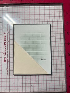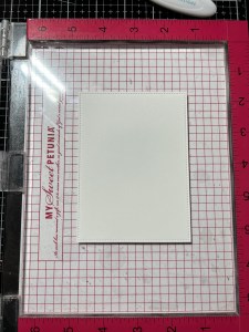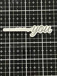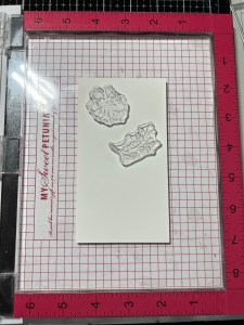 There is a tiny stamp that goes with my sentiment that I need to figure out placement. To do this, I place my panel back onto my Grip Mat in my MISTI then lay out my focal image and sentiment so I can line up my stamp. I then pick up the stamp with the door of my MISTI and remove my focal image and sentiment. Using Amalgam Obsidian Black Ink I stamp the sub sentiment onto the panel. Using Liquid Glue, I adhere my panel onto a Barely There Cardstock side folding card base. (Which is cut 5 1/2″ x 8 1/2″ and scored at 4 1/4″)