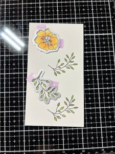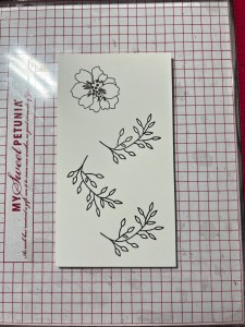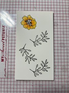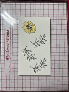 Next, I place another piece of White Cardstock into my MISTI and stamp the smaller flower and outline vine images from the same Wishing You Well Stamp Set using Amalgam Obsidian Black Ink. I then take the solid images for these two stamps, line them up and pick them up with the door of my MISTI. For the flower, I ink up the stamp using Sweet Corn Ink then stamp it over the outline image.