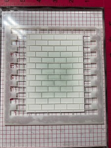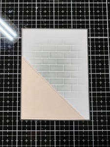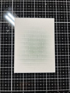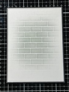 Next, I take the largest stitched rectangle die from the Master Layouts 2 Die Set and cut out of White Cardstock, running them through my P6. I then place the panel onto my Grip Mat that is in my MISTI then place my Brick Wall Stencil over the panel and press the edges onto the Grip Mat to hold it into place. Taking my Blending Brush, I blend Moonlit Fog Ink over the center of my panel and fade the ink out. I want to add the stenciling just behind my focal image then fade out, I don’t want my entire panel to show the stenciled image.