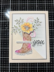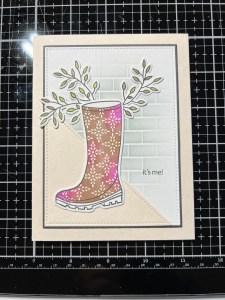 Now it’s time to assemble my focal image. I start by adhering the boot image over the rectangle die using Liquid Glue. I then arrange the greenery and adhere down using Liquid Glue. To add another filler element I ended up stamping the swirl image from the same Wishing You Well Stamp Set using the same ink color from the boot stamping, cut them out with the coordinating dies and glued them down.