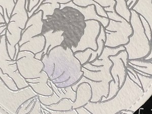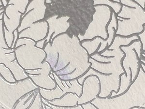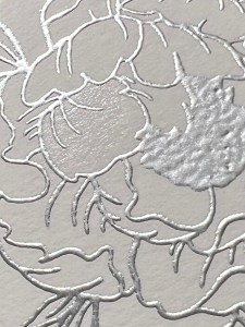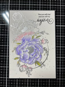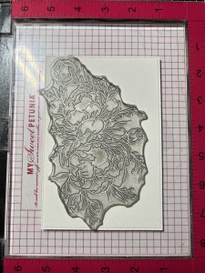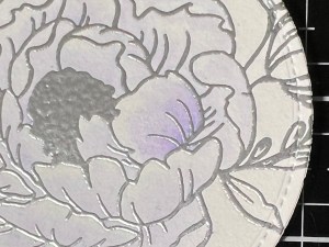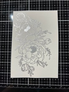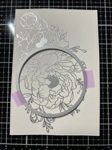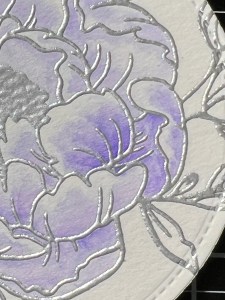 To start, I take the large stitched rectangle die from the Master Layouts 8 Die Set and cut out of Watercolor Cardstock, running them through my Platinum 6 Die Cut Machine. Next, I place the panel onto my Grip Mat that I have in my MISTI Stamp Positioner. *This grip mat is not a “sticky” mat but a mat that is made up of the same photopolymer material as stamps which provides a natural tackiness to it. Whenever it needs cleaning, I use a little stamp cleaner or mild soap and wipe it clean. I am really loving this tool to help hold my cardstock in place while stamping. I then prep my panel well with my Anti Static Powder Tool and place an my image from the Majestic Peony Stamp Set over it and stamp it using Versamark Ink. I repeat the stamping a couple of times to ensure good ink coverage, add Silver Embossing Powder then heat set with my Heat Tool.