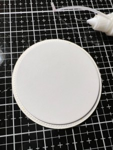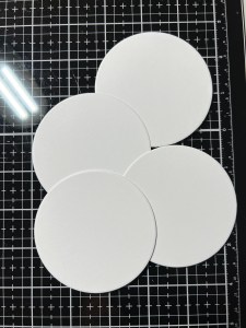 To help my spotlight piece stand out, I take the plain circle die from the Master Layouts 8 Die Set and cut out of White Cardstock four times, running them through my P6. Using Liquid Glue, I stack and adhere the pieces together, then glue them onto the back of my watercolor piece, then onto my card front, making sure to line up the design. To break up the stark white of the panel, I take a small amount of Black Soot Paint and spatter over the panel using a small paintbrush. I allow the paint to dry for several minutes then use Liquid Glue to adhere the panel to an Innocent Pink Cardstock card base. *I cut a sheet of cardstock to be 7″ x 10″ and scored it at 5″ to create my card base.