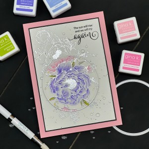 Today, I wanted to revisit the spotlight technique using the Majestic Peony stamp set from Gina K Designs. This is a gorgeous stamp set with a huge peony image that is perfect for this technique! This image is beautiful to watercolor in it’s entirety, but today I thought it would be fun to watercolor a portion of it, leaving the rest of the embossed design, uncolored. With this image being so big, I went with a 5 x 7 layout to capture all of its beauty! If you have been wanting to give watercoloring a try but don’t want to invest in expensive paints, use what you have! For my coloring today, I used Gina’s dye ink pads. Using ink pads offers such a wide variety of colors that I already have on hand and coordinates so well together with Gina’s cardstock. Watercolor can be as simple or elaborate as we want to make it. Using watercolor cardstock is key, vs regular cardstock. I use Canson XL watercolor cardstock for all of my watercoloring. It is great quality at an affordable price! All of the inks, cardstock, stamps and dies I use on today’s card are from Gina K Designs. Let’s get started!!