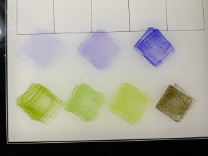Taking the ink colors that I want to use, I press them onto my Glass Mat, I will use this as my palette. I then fill my Water Brush with clean water and scribble my colors out onto a scrap piece of the same Watercolor Cardstock that I will be using. This helps me to see the actual colors and helps me to decide which to use. I also like to have a paper towel on hand for cleaning off my Water Brush or removing excess water from it.
