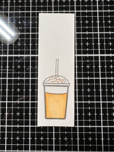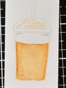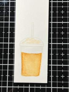 For my coloring, I will be using my Zig Clean Color Real Brush Markers as well as a Water Brush. Before coloring, I like to swatch out some colors I may want to use onto a scrap piece of the same cardstock I stamped my image onto. This helps me to decide which shade to go with and see how the color blends on the cardstock. To start my coloring of the drink, I take Mustard – 067 and draw some color on the left side of the cup. I then take my Water Brush filled with clean water and blend the color out, towards the center of the image. I then add the same color along the right side of the image. Again, I take my Water Brush and blend the color out towards the center of the image.