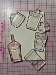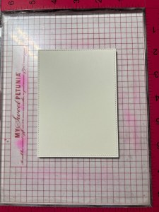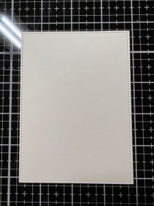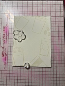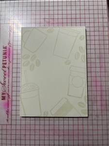 Taking the largest stitched rectangle die from the Master Layouts 2 Die Set, I cut out of Ivory Cardstock, running them through my Platinum 6 Die Cut Machine. I then place the panel onto my Grip Mat and place several images from the Daily Grind Stamp Set around the outside of my panel, allowing them to hang off the edges. I pick the stamps up with the door of my MISTI and stamp them onto the panel using Whisper Ink.
