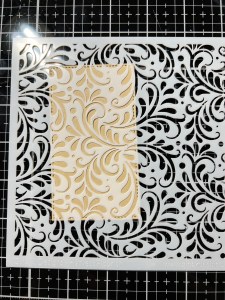 To create a base for my focal image, I take the smaller stitched rectangle from the same Master Layouts 2 Die Set and cut out of Kraft Cardstock, running them through my P6. I wanted to add a little interest to this panel so I place the Harvest Flourish Stencil over my panel and using a Sponge Dauber, I blend White Pigment Ink over the stencil and fade it out so that most of the design is in the center. To add some dimension to my card, I add Foam Squares to the back of the panel then mount it onto my card front, just off center. I then add Foam Squares onto the back of the colored image and mount it onto the center of my panel.