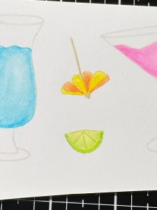 To add some interest and create a liquid look to my glasses, I trace and fill in the colored portion of my glass with Glossy Accents. After allowing the pieces to dry for a couple of hours, I take my Fine Tip Glue Bottle filled with Liquid Glue and apply a very thin line of glue to the front rim of the margarita glass then add Rock Candy Glitter over the glue. I set the piece aside to dry while I work on the panel of my card.