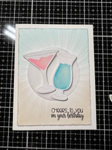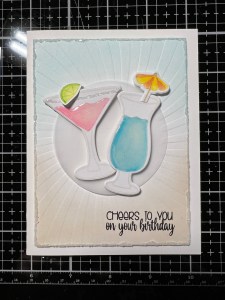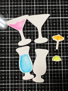 To anchor the images onto my card front, I take the frame die from the Circle Shadow Shaker Die and cut it out of Vellum, running them through my P6 and use the inside piece. I then place add Foam Tape to the backs of my glasses and mount them onto the Vellum circle die cut piece. To adhere the Vellum onto my card front, I add Liquid Glue to the back of the Vellum, only where the glasses are. This helps to hide the glue so it doesn’t show through the vellum once mounted. I adhere the vellum onto my card front then use Liquid Glue to adhere the umbrella and lime images onto the glasses.