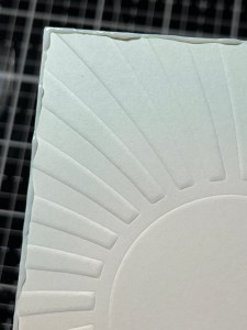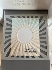 Next, I place the panel into my MISTI and place a sentiment from the same Cheers Stamp Bundle over the lower right corner of my panel. I then stamp the sentiment using Amalgam Obsidian Black Ink onto the panel. Once the ink is completely dry, I dry emboss my panel. I place the panel over an embossing mat then place my Swirled Sun Stencil over the panel, centered and ran them through my P6. **The sandwich order I use is the platform base A, platform top B, embossing mat E, cardstock panel, stencil and adapter plate D, then run them through.