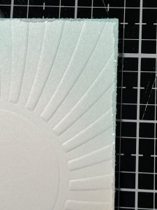 To add some sparkle and interest to my embossed panel, I put some Liquid Glue onto a nonstick surface then dab my finger into the glue and run it down all four sides of the panel. I then sprinkle Rock Candy Glitter over the glue and set the panel aside to completely dry.