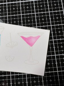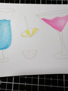 To color my images, I choose the ink cube colors I want to use and press them onto my Glass Mat and use this as my palette (I ended up not using the purple and replaced it with orange). I then take my Water Brush filled with clean water and gently squeeze the barrel to release some water into the bristles, then swirl the brush into a little bit of the Blue Raspberry Ink and apply it to the left portion of my image. I then take my Water Brush and blend the color out towards the right side, filling in all areas of the inside of the glass. *If the bristles become too dry to blend the ink, I gently press the barrel to release more water. For my next image, I clean off the bristles of my Water Brush onto a paper towel then swirl the brush into a little bit of Passionate Pink Ink and apply it to the left side of portion of the image and outline the rest of the area. I then blend the ink out towards the right side of the image. *I do try to leave a lighter, highlighted area of ink just off center to the right of both images.