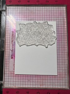 For my sentiment, I place a post it note into my MISTI then choose a sentiment from the Beautiful Roses Bundle and stamp it onto the post it note. I then take the coordinating die from the same Beautiful Roses Bundle and cut out of a piece of White Cardstock, running them through my Intri-Cut. Taking the negative piece, I line it up over the post it note so it is centered, then place my die cut piece back into the cut out over the stamped sentiment.