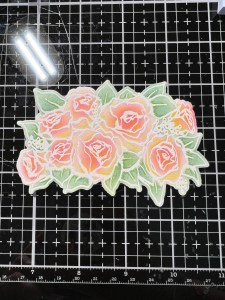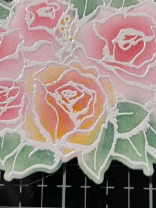 For the vase, I placed a piece of Vellum into my MISTI, positioned the image from the same Beautiful Roses Bundle, prepped the Vellum with my Anti Static Powder Bag then stamped the image using Versamark Ink. I then placed the stems image inside the previously stamped vase then added White Embossing Powder and heat set with my Heat Tool. Using the coordinating die from the same Beautiful Roses Bundle I cut the image out, running them through my Intri-Cut.