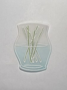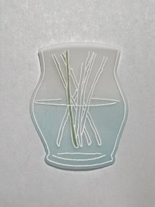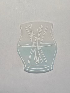 To color my vase, I turn the Vellum image over and use my Mini Blending Brush to blend some Turquoise Sea Ink onto the back side where the water image is. I then take my green PC911 Prismacolor Pencil and color in the stems. *keeping the pencil very sharp helps to stay within the narrow lines. Using Liquid Glue, I adhere the flowers onto the vellum vase and set it aside.