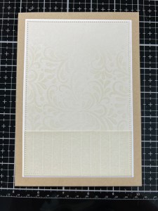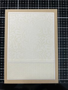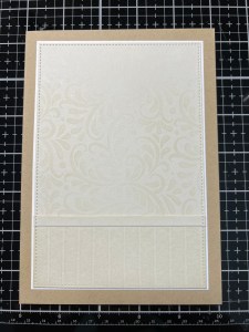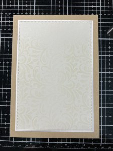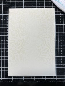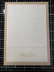 I now move on to my card base. Using the large stitched die from Master Layouts 8 Die Set, I cut out of Whisper Cardstock, running them through my Intri-Cut. I then place the panel onto my Sticky Mat and place the Harvest Flourish Stencil over the panel and press down on the edges of the stencil to adhere it onto the mat. Using my Blending Brush, I blend Whisper Ink over most of the panel, as the bottom portion will later be covered. ***you will notice later that I mounted my panel upside down onto the card base so that the unblended portion ends up on top… OOPS!!