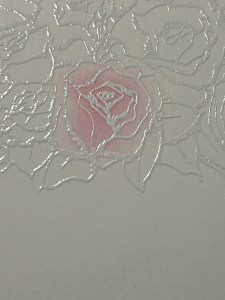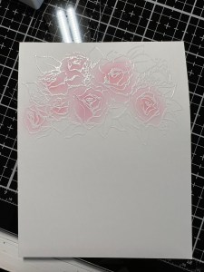 To start, I place a panel of White Cardstock onto my grip mat that I have in my MISTI Stamp Positioner and position the large floral stamp from the Beautiful Roses Bundle onto the panel. Next, I pick up the stamp with the door of my MISTI and prep my panel using a Anti Static Powder Bag. I then stamp the image using Versamark Ink, stamping it a couple of times to get good coverage then add White Embossing Powder and heat setting it using my Heat Tool. To color my images, I use my Mini Blending Brush and blend Light Carnation Ink over all of the rose images. I then use my Detail Blending Brush to blend Medium Carnation Ink over the centers of the roses.