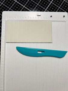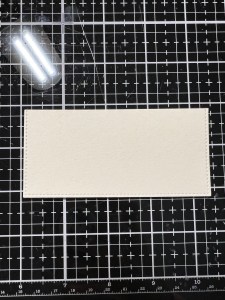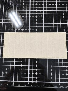 I now want something for my vase to sit on, so I used the same large stitched rectangle from Master Layouts 8 Die Set and cut out of Whisper Cardstock, then cut off a 1 3/4″ piece from that panel. To give it a planked, woodgrain look I placed the piece into my Scoreboard and scored it at every 3/8″. To add some color, I dragged my Whisper Ink Cube down the planks until I was happy with the color. To create a ledge, I trimmed off 1/4″ from the leftover panel where I cut the planked piece from.