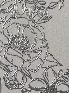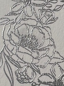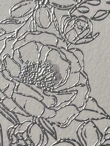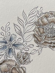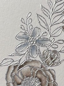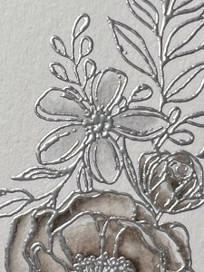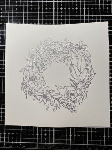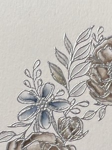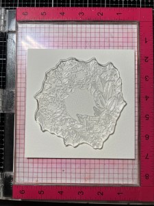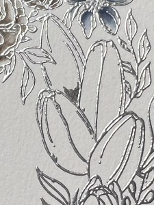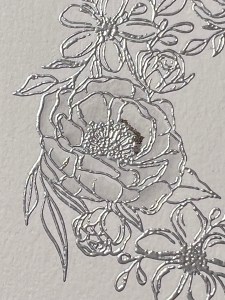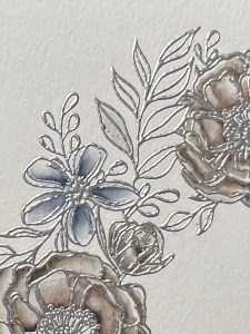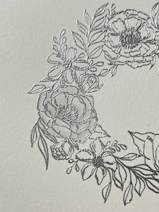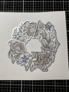 I start by placing a piece of Watercolor Cardstock onto a grip mat that I keep in my MISTI Stamp Positioner then place the large wreath image from the Bouquet Frame Bundle over the panel and pick it up with the door of my MISTI. I prep my cardstock with my Anti Static Powder then stamp the image using Versamark Ink. *With the texture of the cardstock, I end up stamping my image 2-3 times to get a good stamped image. I then add Silver Embossing Powder and heat set with my Heat Tool.