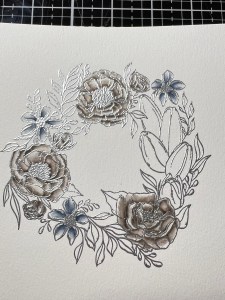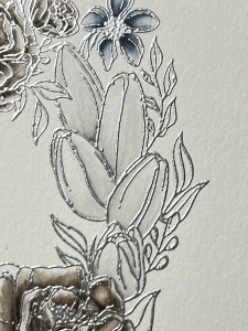 Next, I add a small amount of Gray Brown – 096 to the base of the petal and again, use my Water Brush to blend the color out. I repeat this for all remaining petals then go back and add another layer of ink to darken up the bases of the petals and areas where petals fold or overlap. I then repeat these steps for all remaining florals of this type, including the buds.