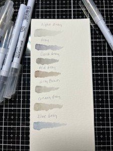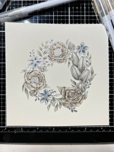 For my leaves, I add Light Gray – 091 to the base then blend out and repeat for the other leaves. I then add Green Gray – 093 to the base, blend out and repeat for all of the remaining leaves. For the remaining little buds or leaves I wanted to bring in more color as I felt there was enough grays and browns, so I just added Blue Gray – 092 and blended them.